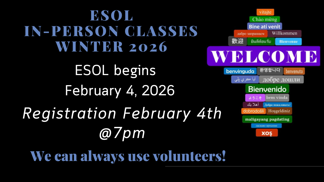 ESOL classes are offered Wednesday nights starting at 7:00-9:00 pm during the two sessions each year.